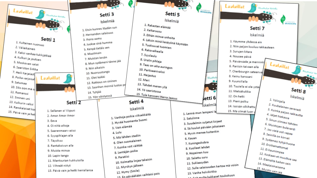 Aloitamme rukouksella (syy löytyy täältä) ja lopetamme johonkin sopivan rauhoittavaan lauluun, mutta muuten mennään osallistujien toiveiden mukaan iskelmiä laidasta laitaan – tavoitteena on yhdessä viihtyminen. Kokoonpanomme on vaihdellut ja vaihtelee – tavoite on antaa myös soitto- ja lauluhaluisille mahdollisuus tulla jakamaan iloa musiikin avulla. 😊